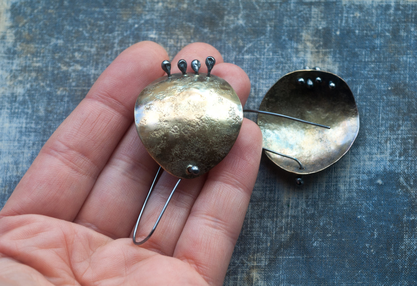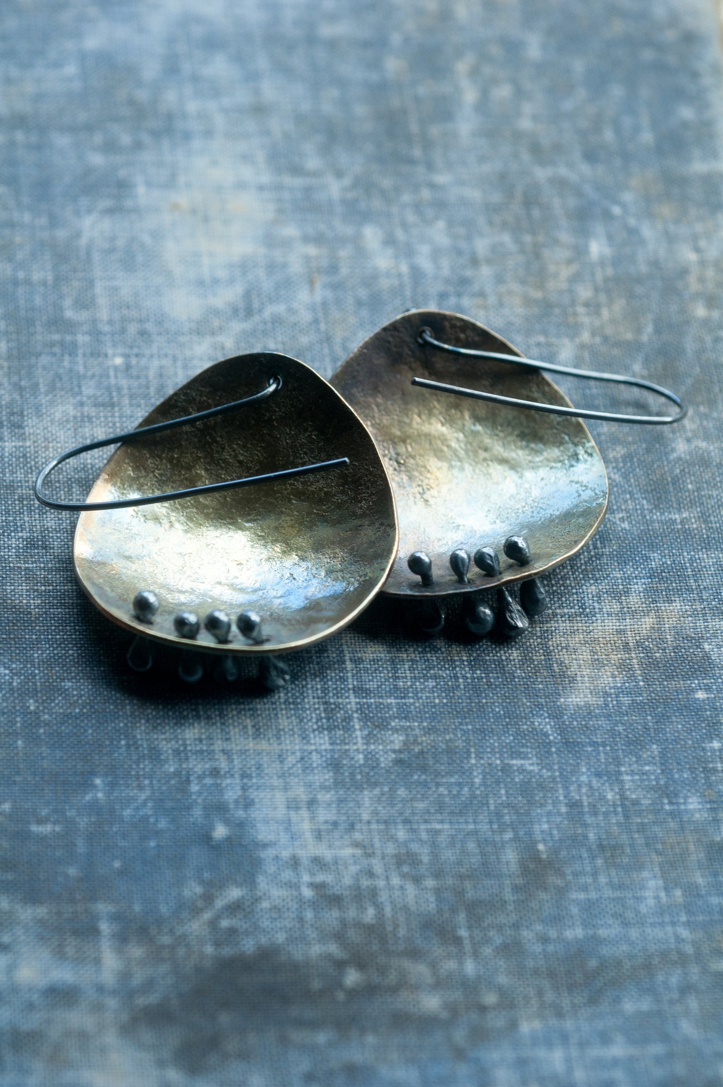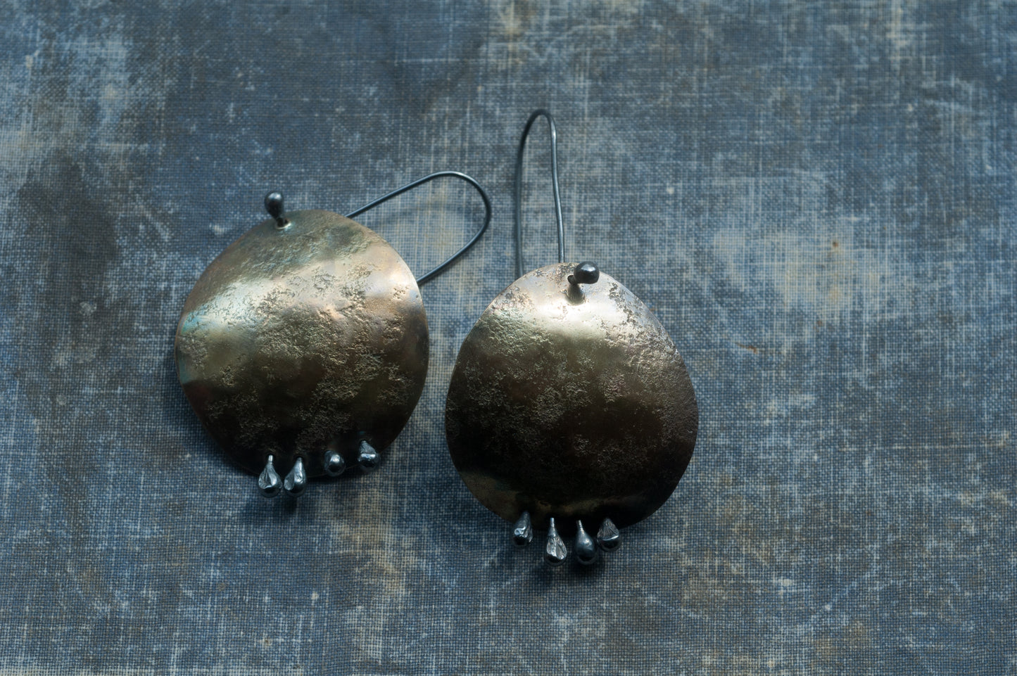 •Handcrafted from brass with sterling silver rivets and ear wires.