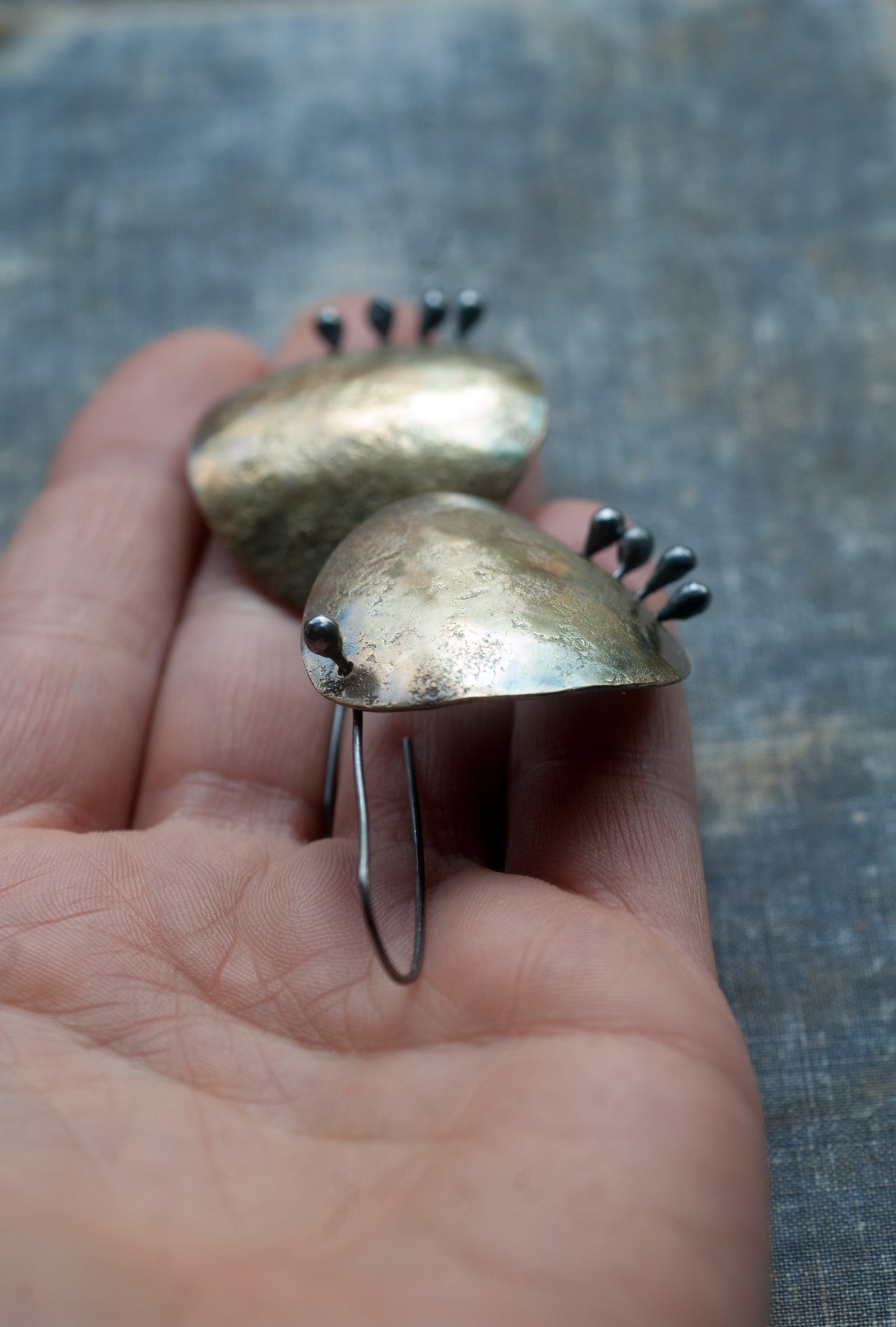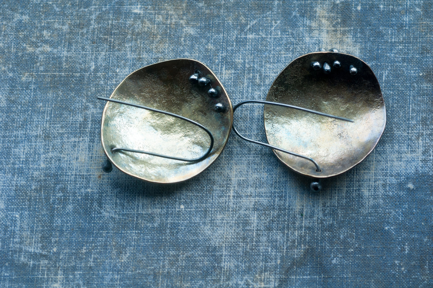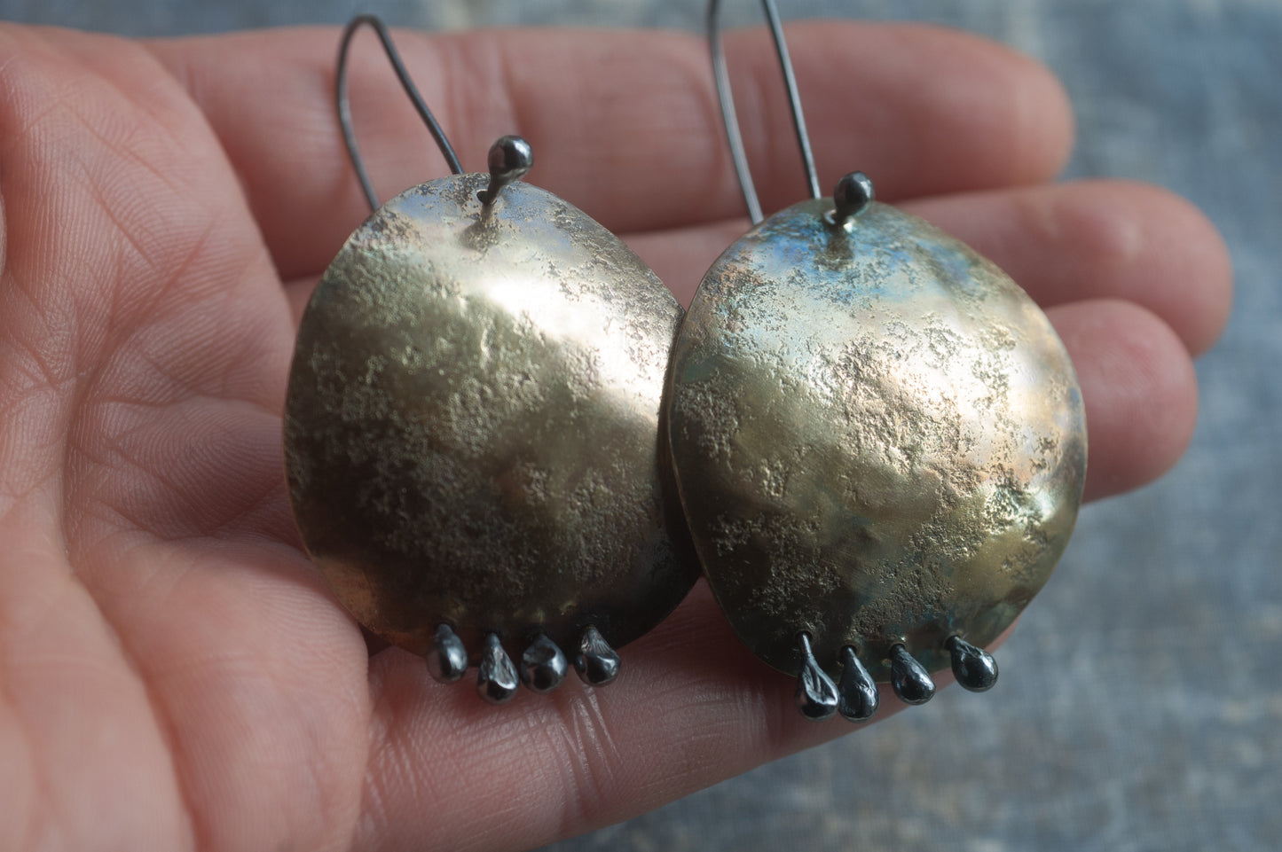 •Handcrafted from brass with sterling silver rivets and ear wires.
