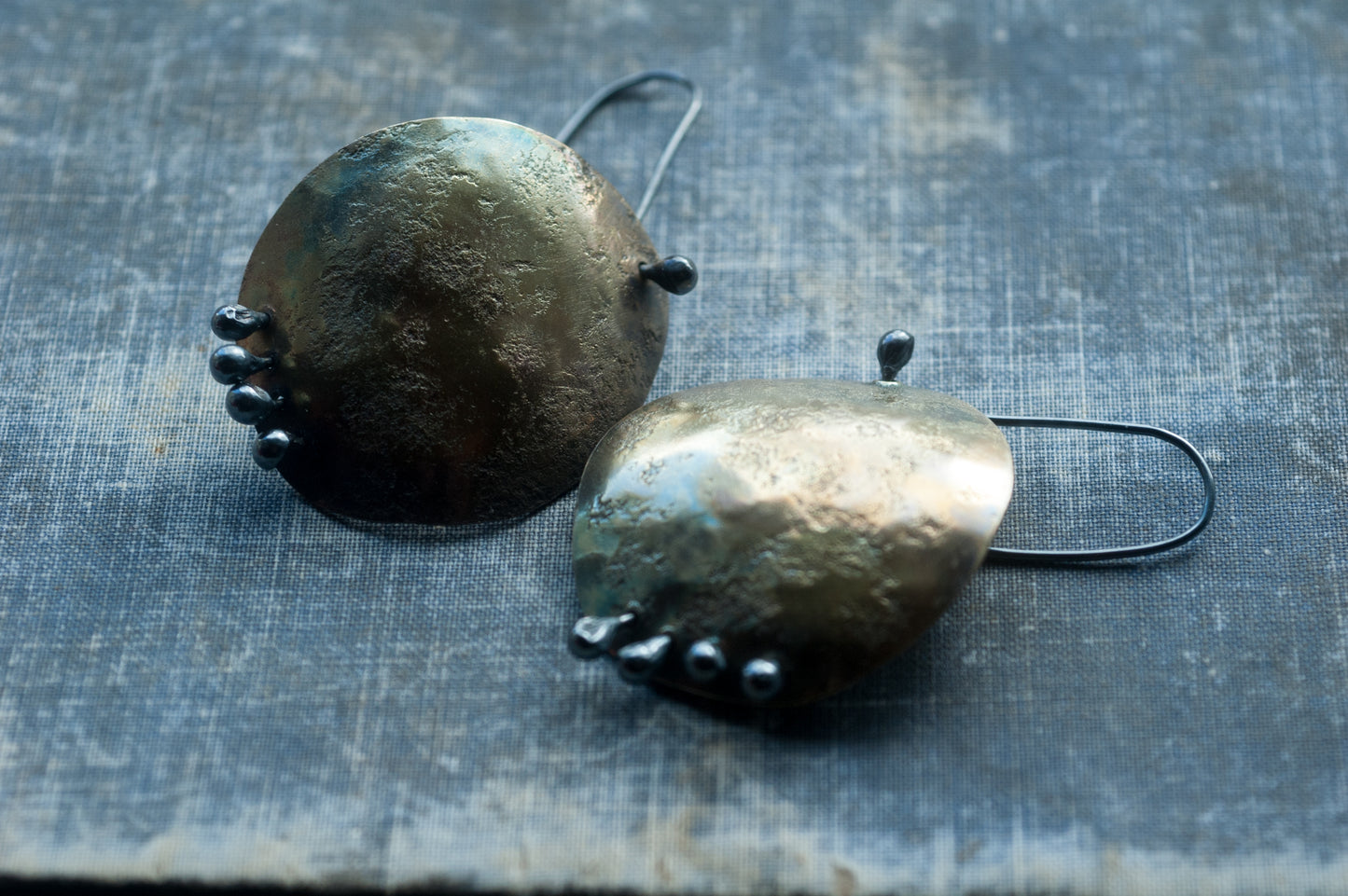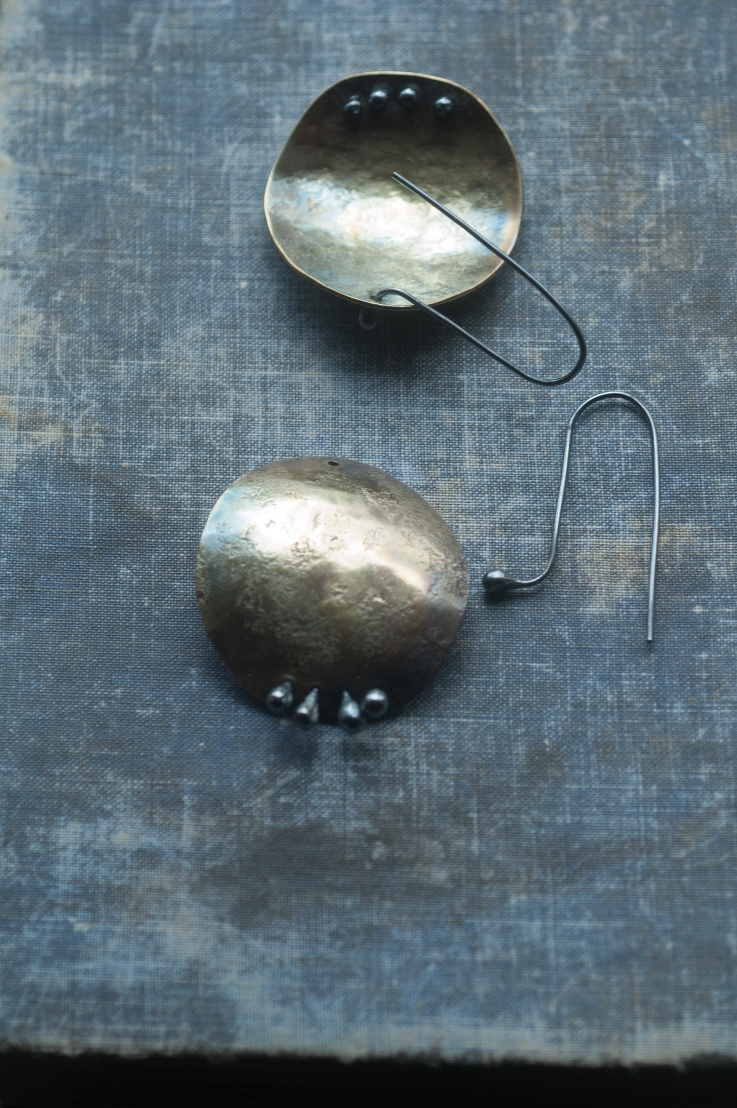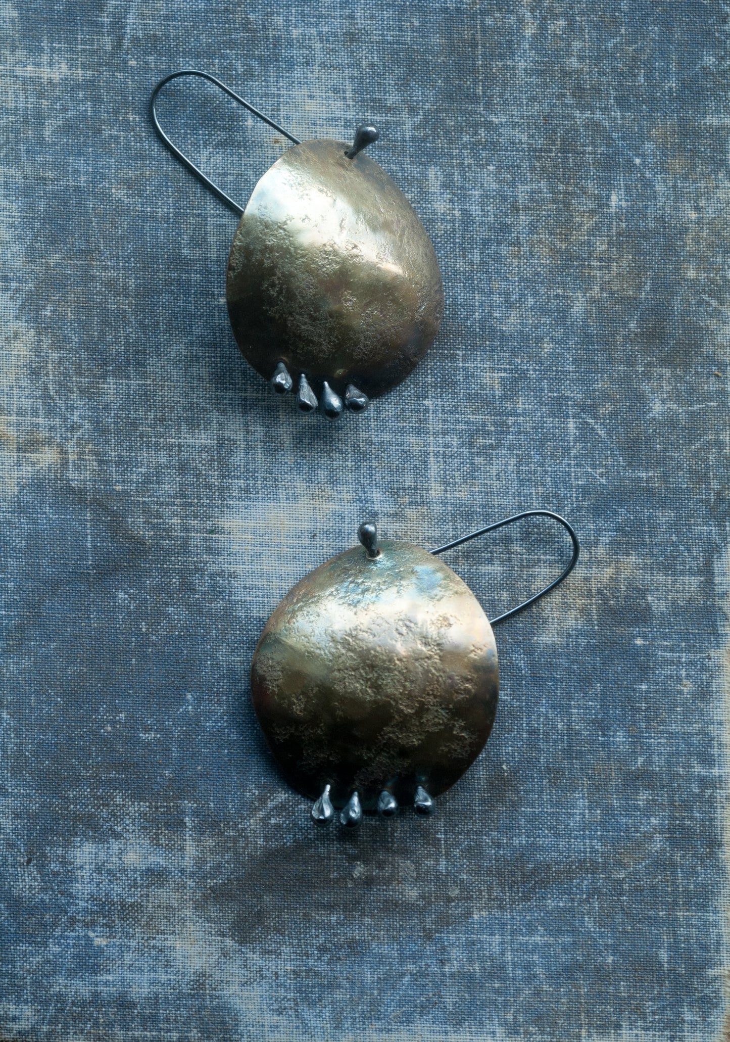 •The rich patina creates varied earthy hues- each pair is unique. Polished for a low mysterious lustre.