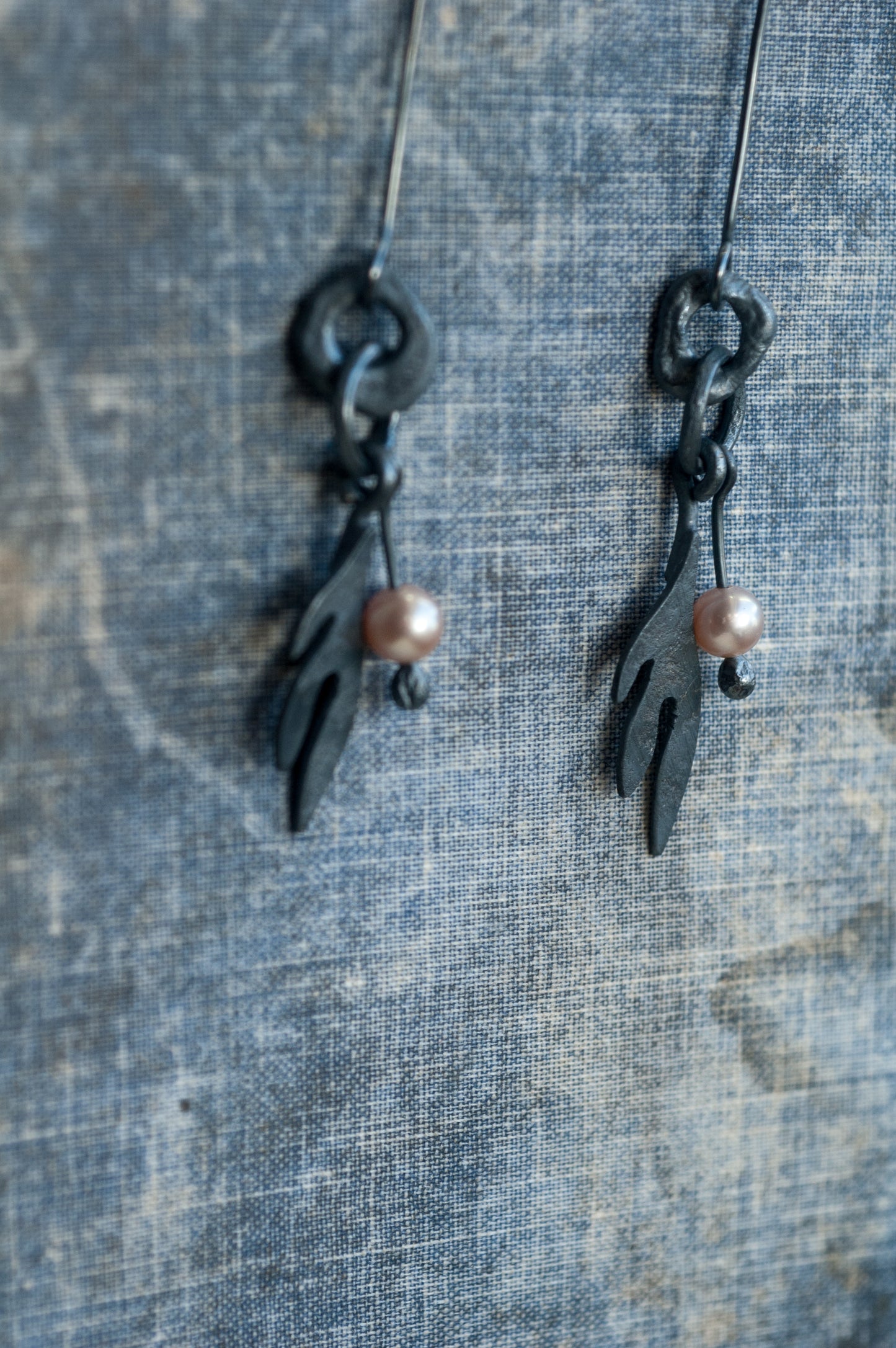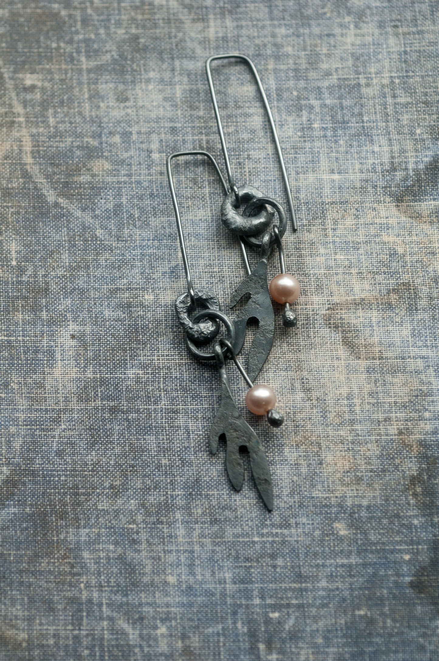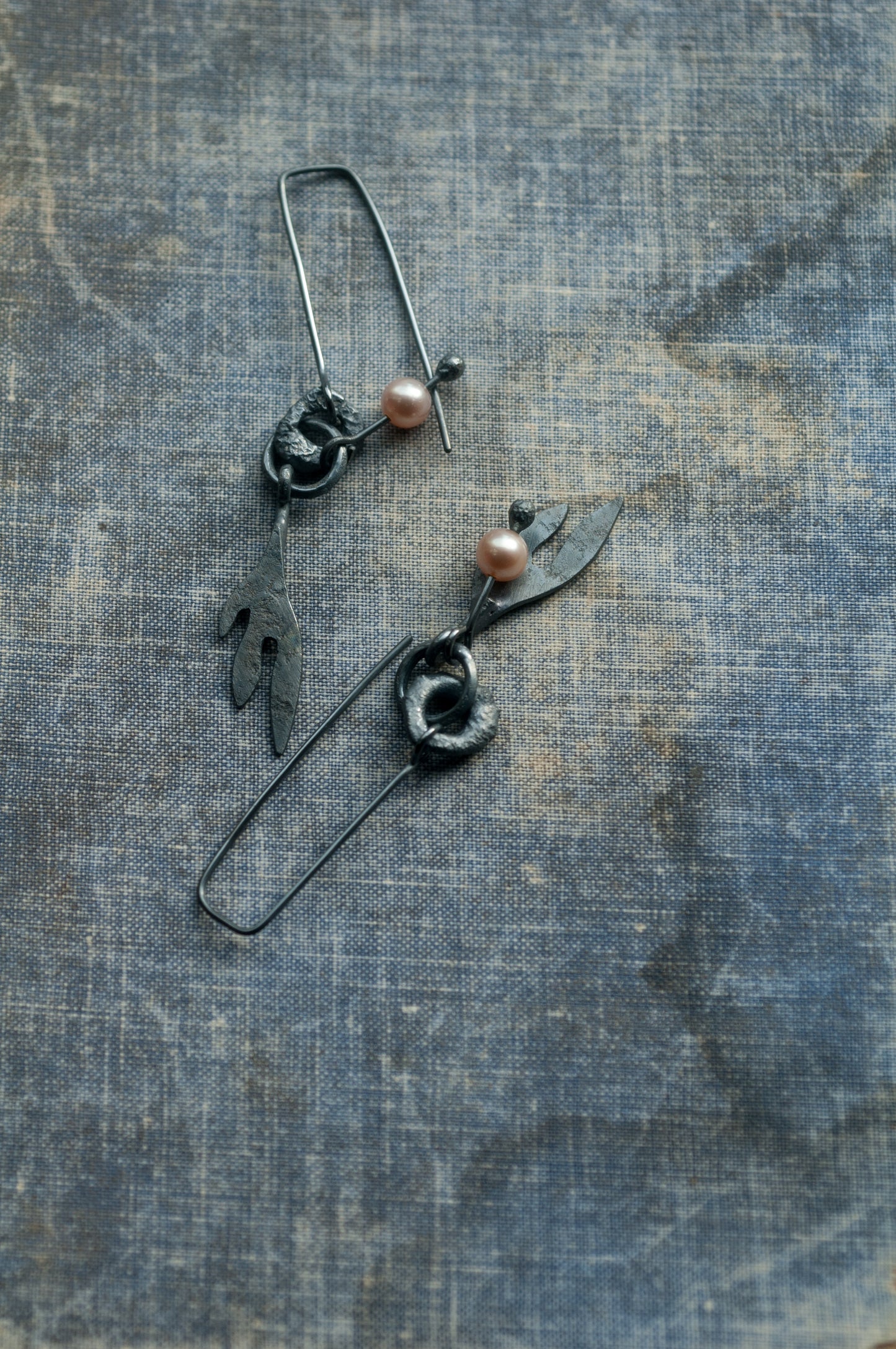 unique edgy botanical earrings with pearl / oxidized sterling silver