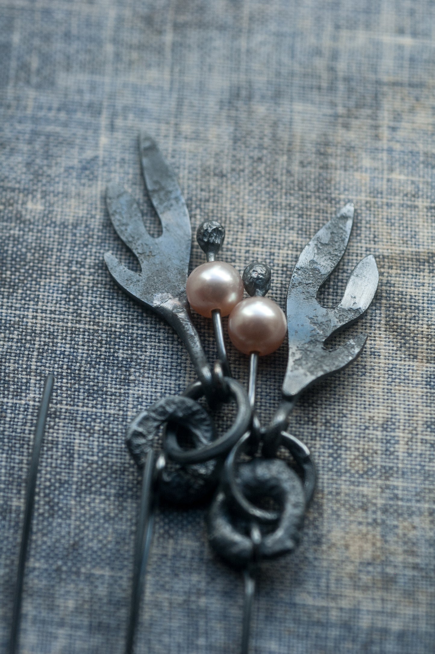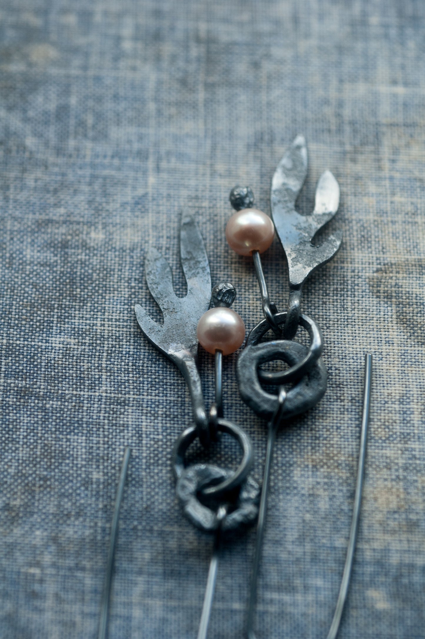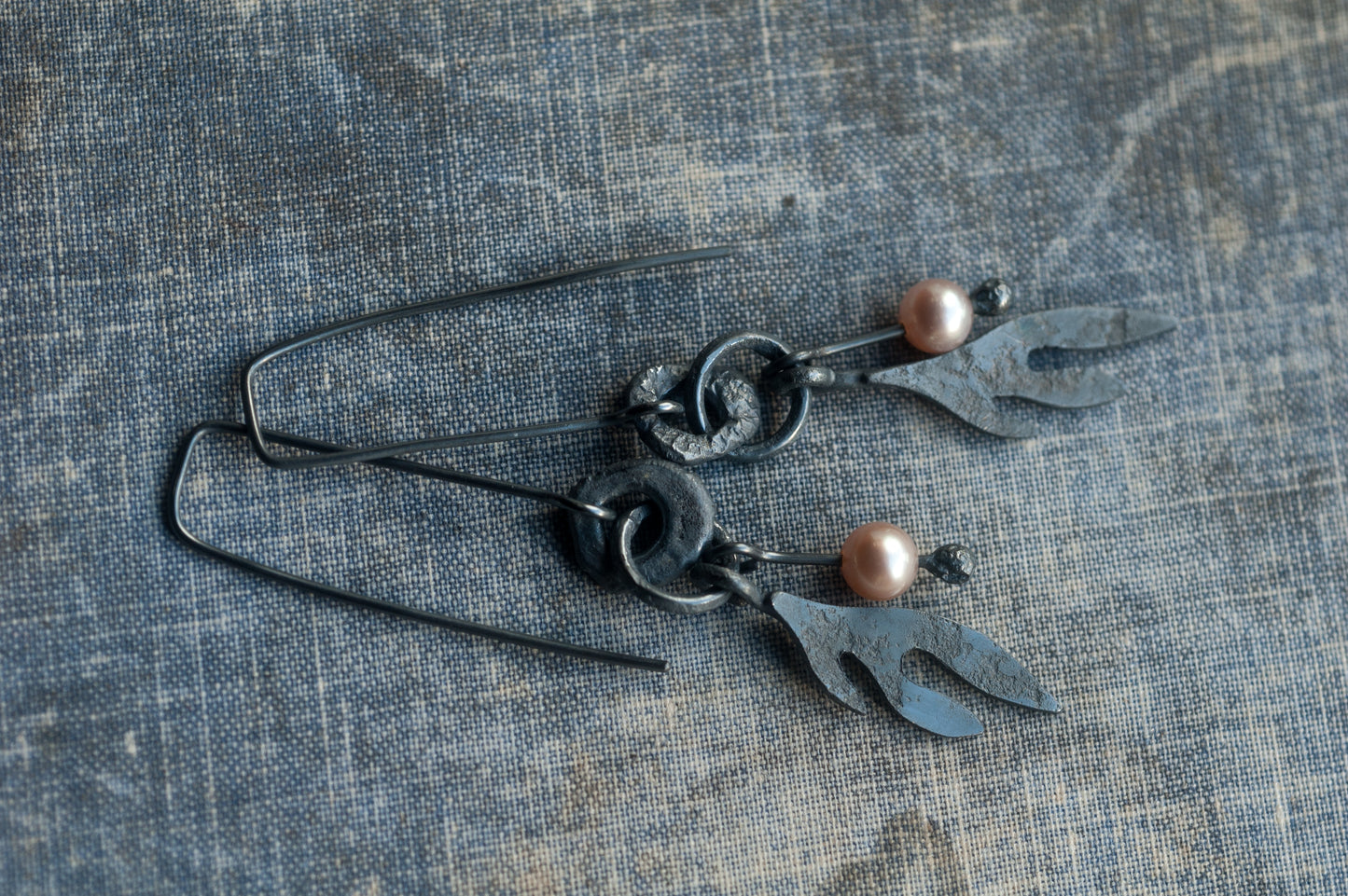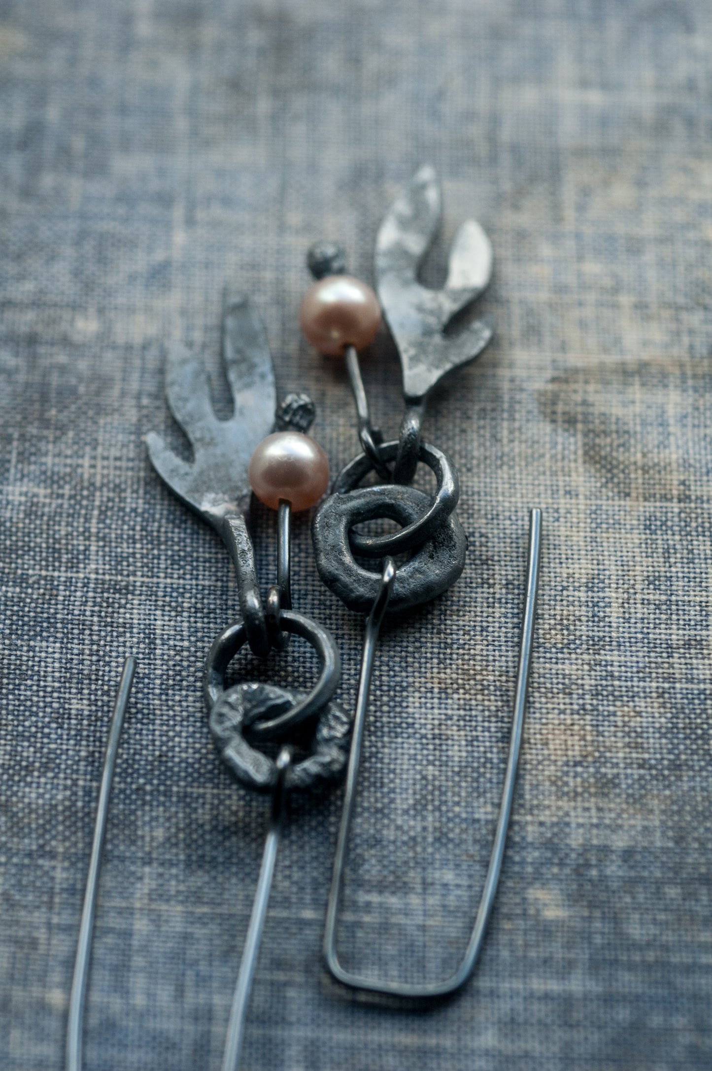 unique edgy botanical earrings with pearl / oxidized sterling silver